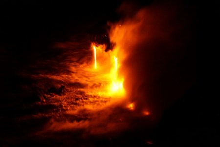 Hot molten lava flows into the sea