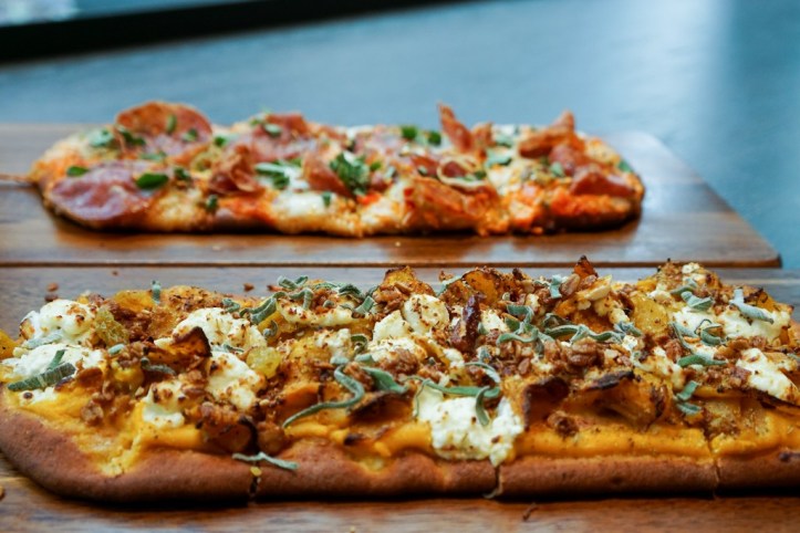 Flatbread pizzas are perfect to share. Butternut squash on pizza is my latest jam. This one has goat cheese, pickled currants, nut and seed clusters, sage, and cabernet vinegar. The salame has mozzarella, Mama Lil’s peppers, and