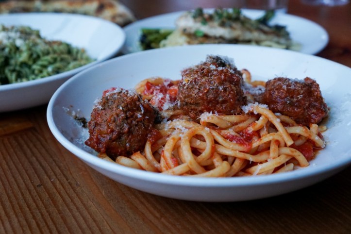 Bucatini & Meatballs, red sauce, grana
