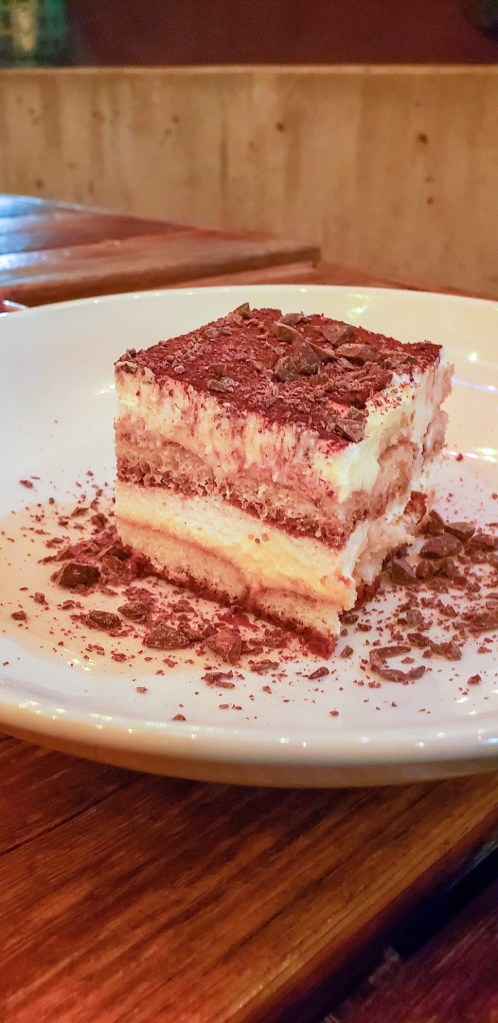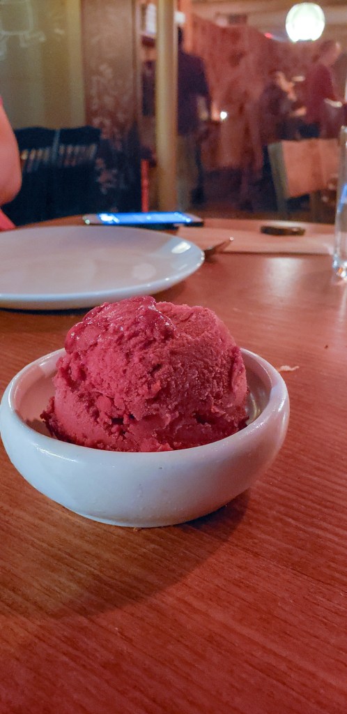 For dessert, the tiramisu ladyfinger stole the show. I’m usually not a fan of tiramisu because it is often too boozy for me. This one surprised me with light flavors that I welcomed after a filling meal. The perfect-sized zeppoli was light and tasty. The blackberry sorbet, courtesy of Gelatiamo, was refreshing! I apologize for the quality of the dessert shots – the lighting became an issue at dusk.