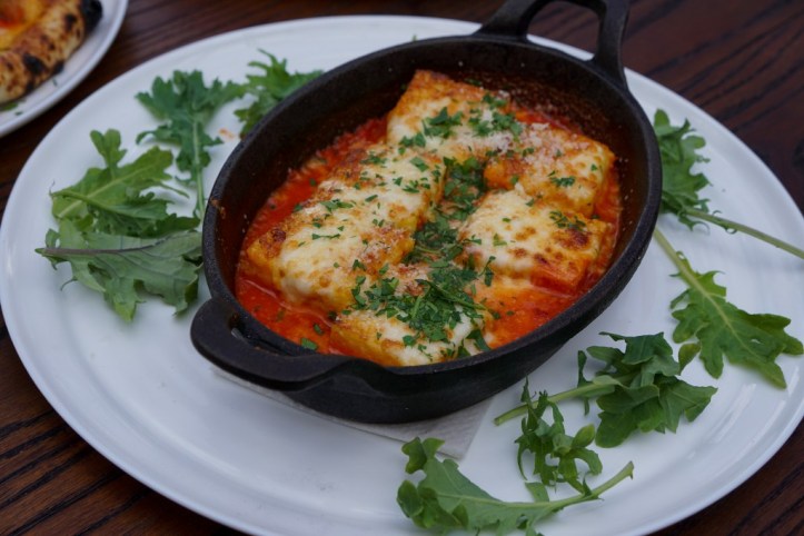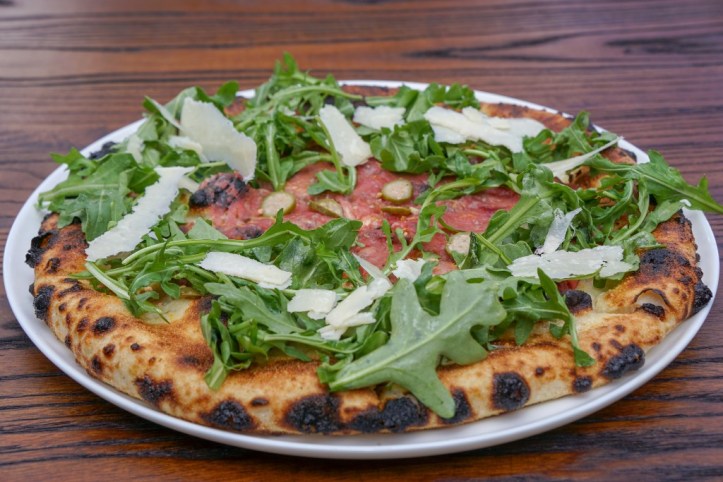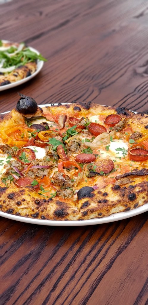 Wow! This is what they opened with! Wagyu carpaccio, shaved pecorino, arugula, lemon, capers, and smoked olives. The crust is described as a cross between soft, Neapolitan-style and a crisper New York crust, which has more body to it. I’d say it hits that mark! The toppings offered salt, citrus, and spice – all things that I love!