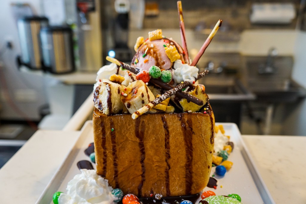 A toast box is another shareable dessert. It’s a piece of toast that’s hollowed out in the middle. Ice cream and other toppings are added, making for a cute presentation!