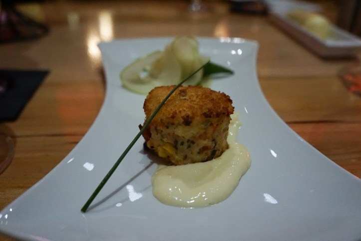 The petite salmon on a stick was a crowd pleaser! It was Alaskan Sockeye traditionally prepared and roasted over Alderwood coals on ironwood sticks. It was served with broccolini and corn fritter cakes. The smokiness of the juicy salmon was perfection! Watching it being prepared was magical as the flames danced off the fire pit. The corn fritter cakes had a bit of sweetness but rooted in savory flavors. The broccolini provided a bit of overall freshness to the dish. This was paired with Antica Terra Pinot Noir “Botanica” from Eola-Amity Hills, Oregon 2014. The wine was smooth and drinkable with this expertly prepared meal.