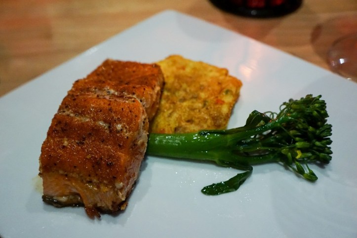 Petite Salmon, Broccolini, Corn Fritter Cake