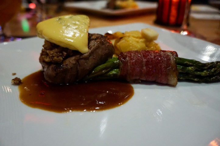 The petit filet mignon was as delicious as it sounds. It was served with roasted garlic-pecan crust, Twin Sisters bleu cheese, thyme demi, Tillamook potato hash laced with apples, and wild boar bacon wrapped asparagus. Generally, I don’t like bleu cheese with my steak but this one from Twin Sisters was flavorful and less pungent than others I’ve tasted. The overall experience was a lovely cut of beef with thoughtful pairings including a 2018 A.W.W “Private Barrel Auction” Rotie Cellars Tannat from Columbia Valley, Washington 2016.