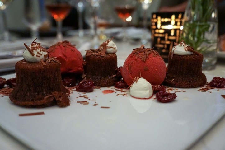 • Chocolate and chianti brown butter cake, chianti poached cherries, cherry sorbetto with vanilla whipped cream.