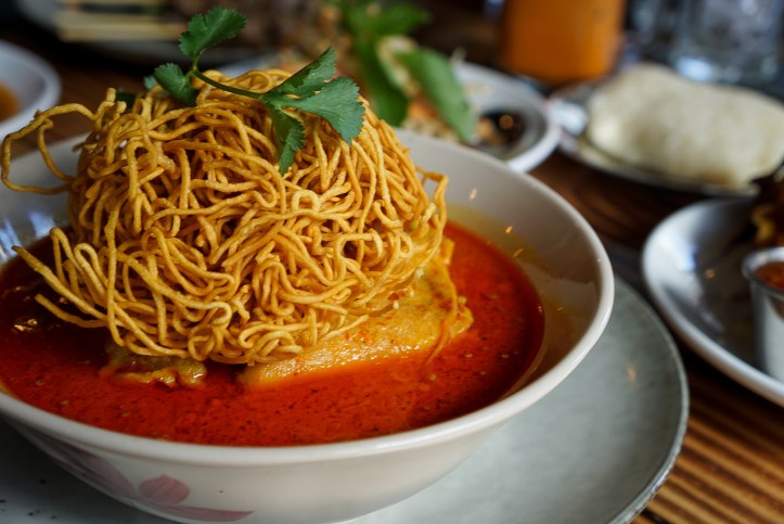 Chiang Mai Curry Noodles, also known as khao soi, is an exceptional dish. Wavy egg noodles and tender chicken thighs are simmered in a spicy curry soup. It’s topped with a nest of crispy egg noodles and served with pickled mustard, red onions, lime and chili oil. It’s easily one of the best in Seattle with an invigorating spice level and heavenly combination of ingredients.