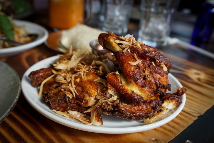 One of the best deals on the menu is the Isarn Set with a large portion of Hat Yai Chicken, Thai Green Papaya Salad and a side of Sticky Rice. The Southern Thai fried chicken is topped with fragrant fried garlic and shallots, adding a lovely texture to the dish. The Papaya Salad adds a nice punch of flavor and freshness while the Sticky Rice is all about comfort. At just $10.95 on the lunch menu, you’ll leave with a full belly.