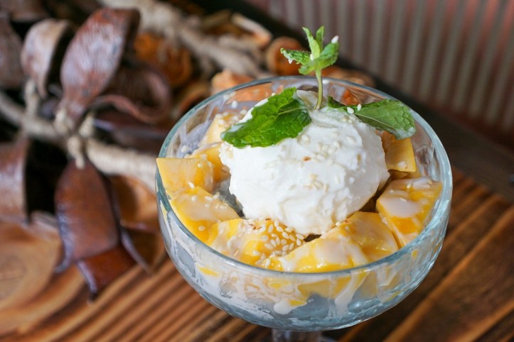 You’ll have to save room for Mango and Sweet Sticky Rice with Coconut Ice Cream. Warm sticky rice, fresh, ripe mango topped with cold coconut ice cream is the perfect way to end a meal!