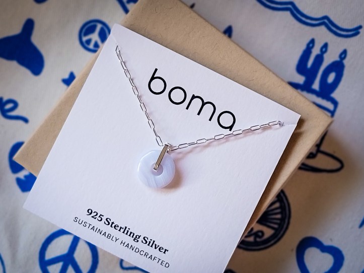 I’m allergic to nickel so I typically use 24K gold jewelry or pieces without metal. Anything less than 24K has additives, one of which is typically nickel that irritates and later scars my skin. Boma uses 925 sterling silver which means it’s 92.5% silver and free of many additives. I was gifted this necklace and I love it! It feels so light, it’s like I’m not wearing anything and looks gorgeous! Blue Lace Agate brings an optimistic outlook and helps one speak their truth. The color is a nice contrast on my skin tone. I’m a fan of Boma!